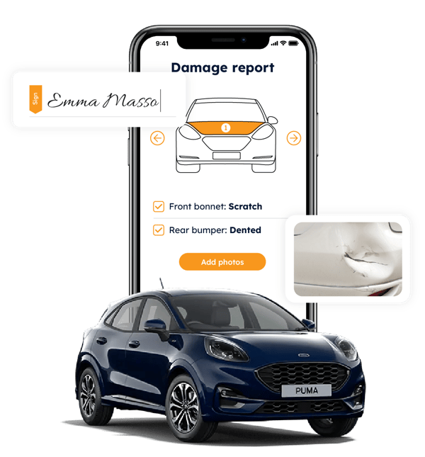 The damage report is then validated by electronic signature, automatically e-mailed to the customer and synchronized with myrentcar (even when entered offline), ensuring full traceability, efficient claims management and easy reinvoicing of damage.