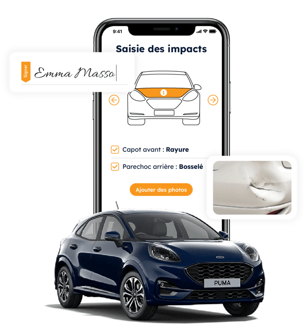 L’état des lieux sur mobile avec myrentpad se réalise directement sur smartphone ou tablette : il suffit de photographier la plaque d’immatriculation pour accéder instantanément au véhicule, puis de renseigner l’état intérieur et extérieur, les équipements, le niveau de carburant et le kilométrage. Les éventuels dommages sont indiqués visuellement par glisser-déposer d’icônes sur un schéma ou des photos.